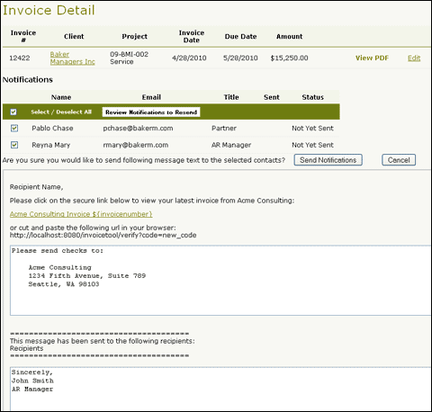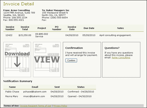 - All contacts at your customer can see who else has viewed or confirmed your invoice. Since Reyna's boss, Pablo, has already confirmed this invoice she knows she can pay this bill without having to talk Pablo directly.